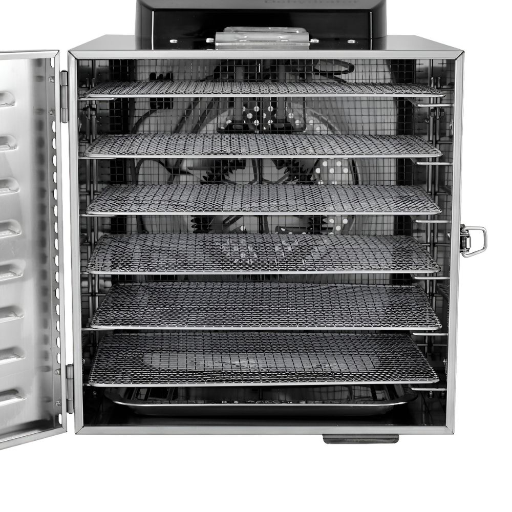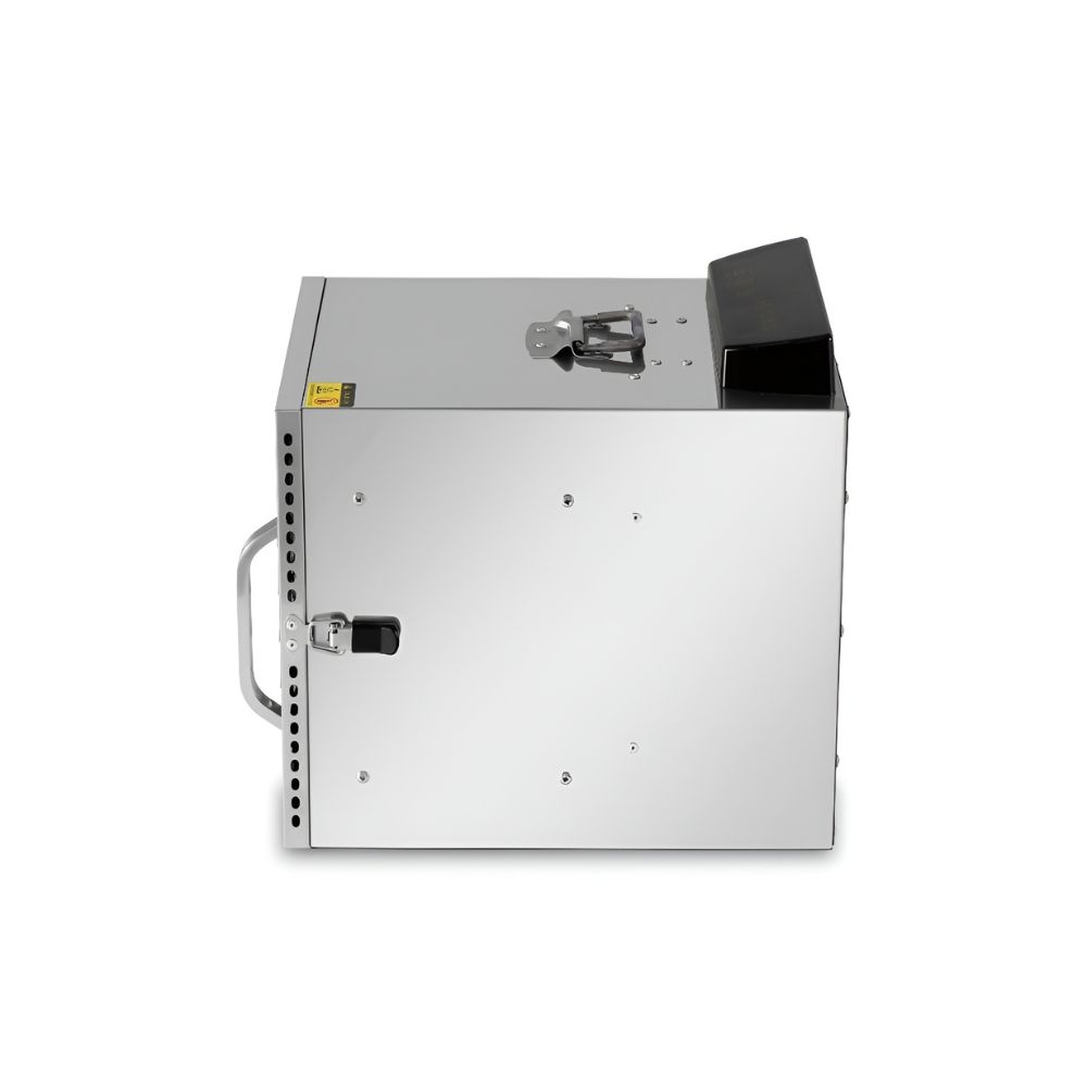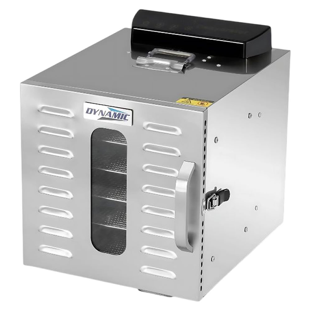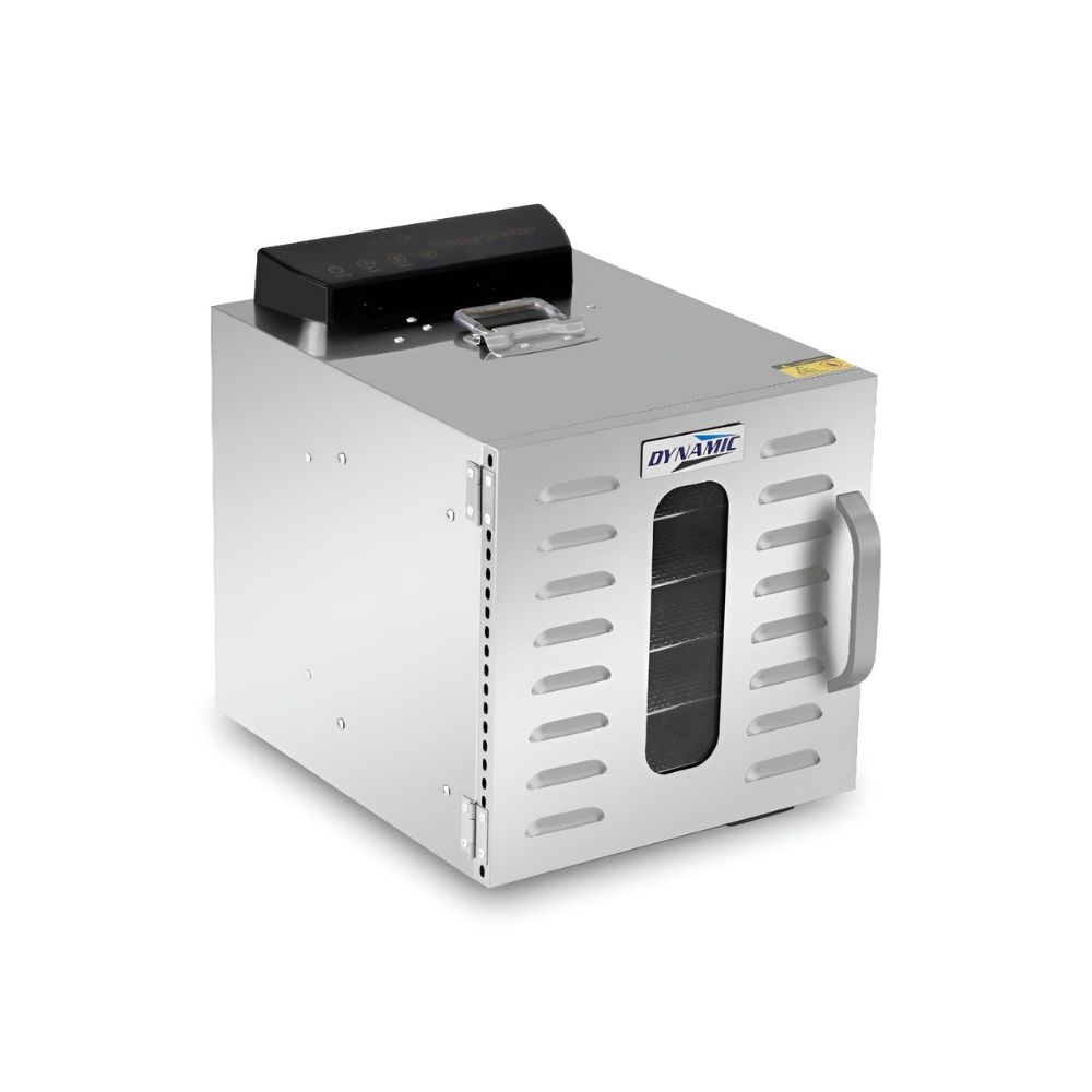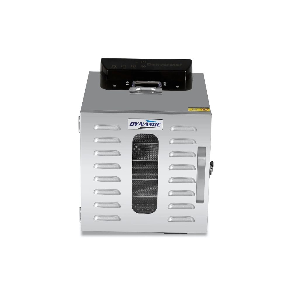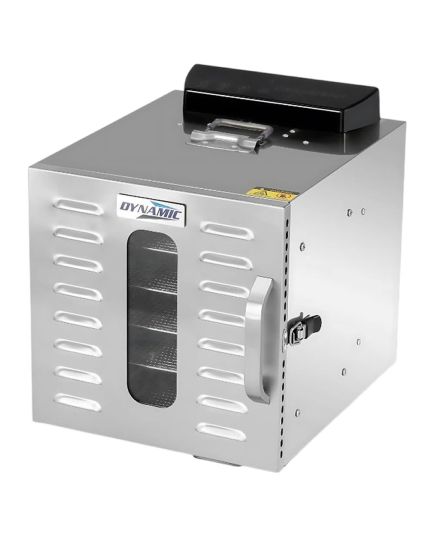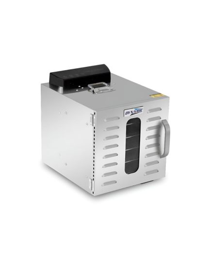 Ο αποξηραντής τροφίμων είναι μια συσκευή αποξήρανσης σε ένα εύρος από 30°C έως 90°C, φρούτα, λαχανικά, μανιτάρια και βότανα. Κατά την αποξήρανσή, αφαιρείται το νερό/υγρασία που περιέχεται στην τροφή και τα τρόφιμα αφυδατώνονται. Έτσι, διατηρούνται τα θρεπτικά συστατικά ενός φρούτου ή λαχανικού εάν αποθηκευτεί σωστά σε αεροστεγή γυάλινα βάζα. Είναι ιδανικό για όμορφα και υγιεινά σνακ όπως φρούτα (αχλάδια, δαμάσκηνα, βερίκοκα, μπανάνες κ.λπ.),σταφίδες, αποξηραμένα λαχανικά για σούπες, αποξηραμένες ντομάτες, αποξηραμένα βότανα, τσάι από βότανα (μέντα, χαμομήλι κλπ.), αποξηραμένα μανιτάρια για σούπες και γεύματα, αποξηραμένα πορτοκάλια για διακόσμηση, αποξηραμένους σπόρους κολοκύθας κ.α. Οι αποξηραντές της σειράς Dynamic διαθέτουν πίνακα οθόνης αφής για ψηφιακό έλεγχο. Η λαβή της πόρτας μπορεί να είναι πλαστική ή αλουμινένια και η συσκευή είναι ανοξείδωτη SUS304. Συνοδεύεται από 6 δίσκους.