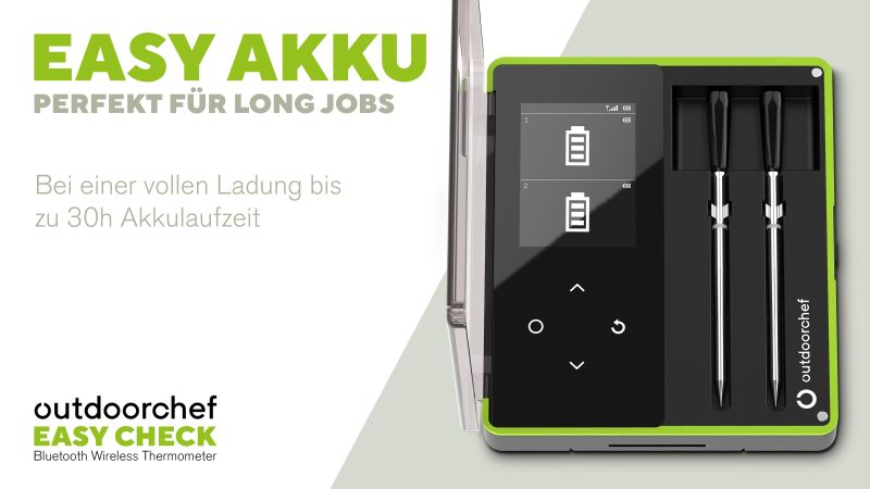 Το Outdoorchef Easy Check Wireless Grillthermometer Dual 14.491.95 είναι το πιο πλήρες θερμόμετρο BBQ της σειράς. Με διπλούς αισθητήρες, μεγάλη εμβέλεια και αυτονομία, σου δίνει τον απόλυτο έλεγχο σε κάθε ψησίμο.