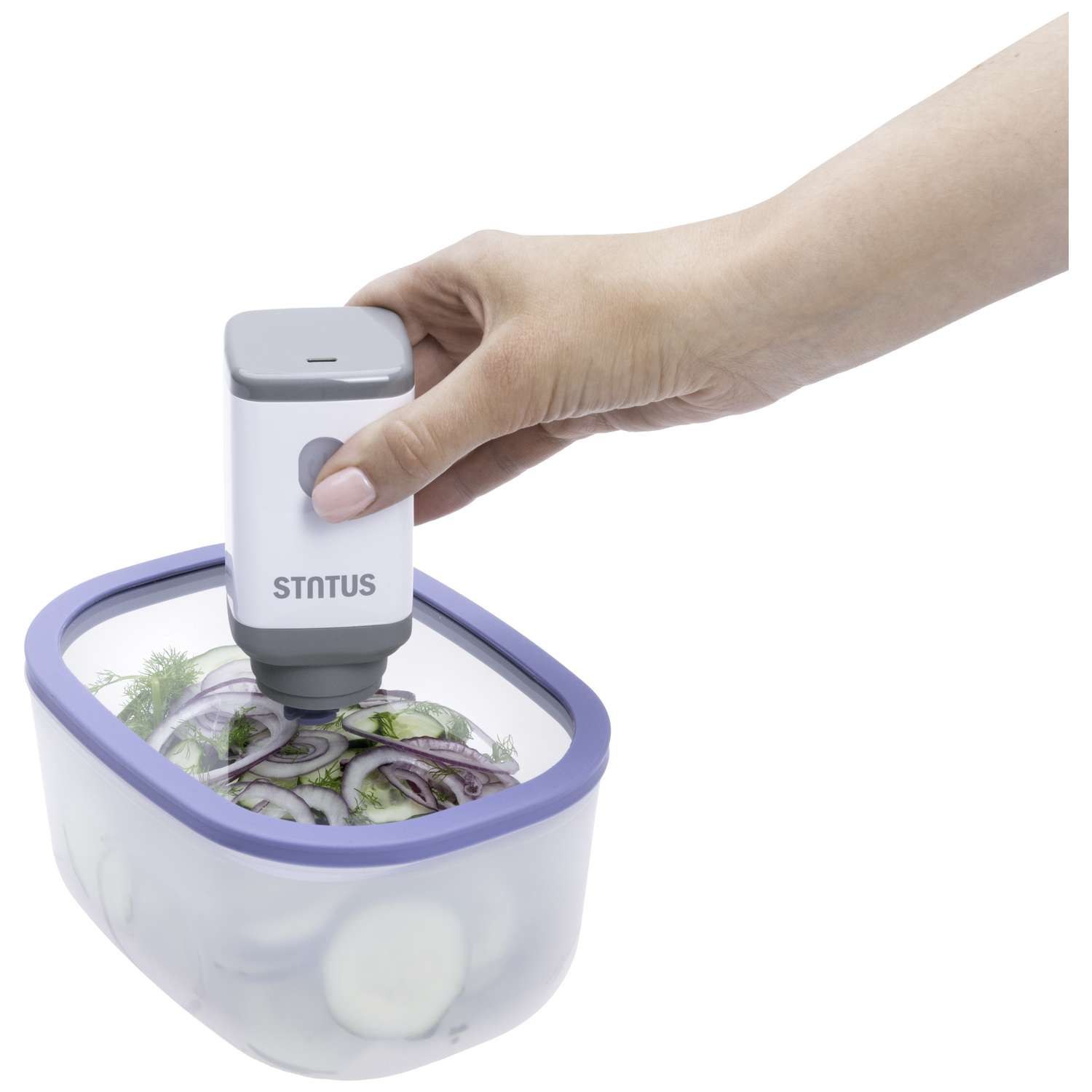 - Το σετ σας επιτρέπει να μαρινάρετε οποιοδήποτε κρέας, εύκολα & γρήγορα ενώ η δημιουργία vacuum μέσω της αντλίας στο εσωτερικό του δοχείου διευκολύνει τη διαδικασία μαριναρίσματος και σας προσφέρει ενα υγιεινό γευστικό γεύμα με όλα του τα θρεπτικά συστατικά! Απλά βάλτε το αγαπημένο σας φαγητό μέσα στο δοχείο αεροστεγούς φύλαξης της STATUS, προσθέστε τα υλικά και τα μπαχαρικά στα οποία θέλετε να μαριναριστεί και έπειτα χρησιμοποιήστε την αντλία! Καθαρισμός Τα δοχεία αεροστεγούς φύλαξης της STATUS πρέπει να καθαριστούν πριν από τη 1η χρήση