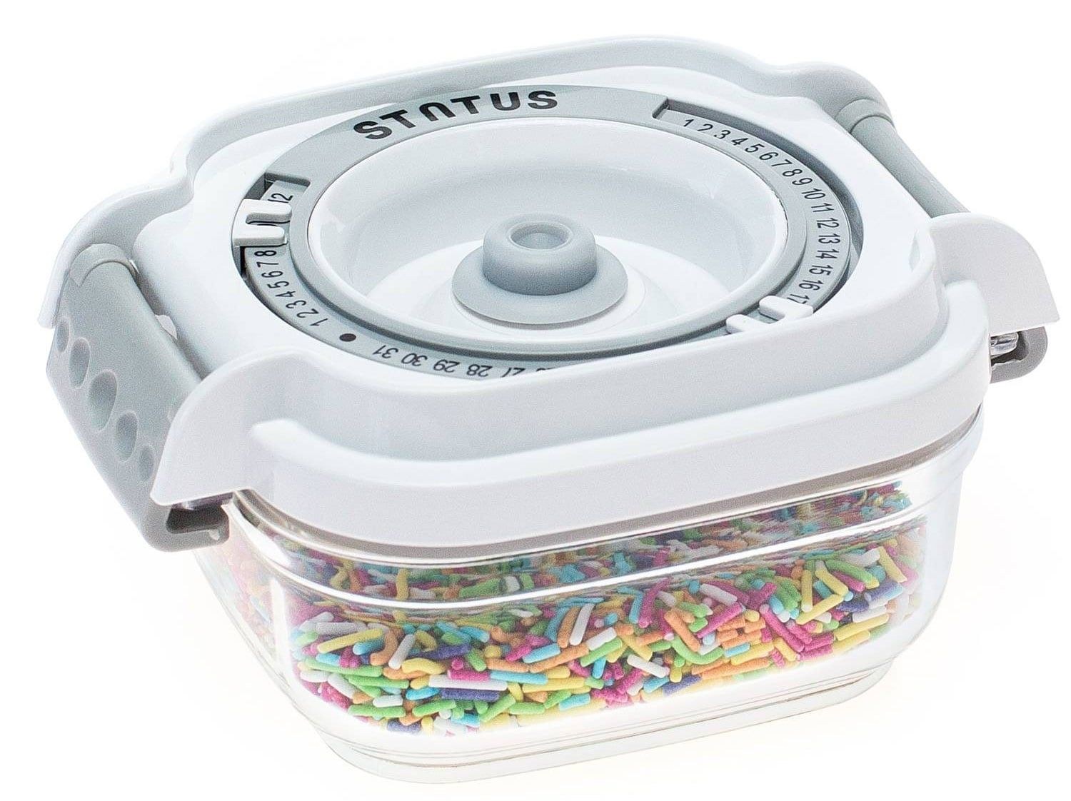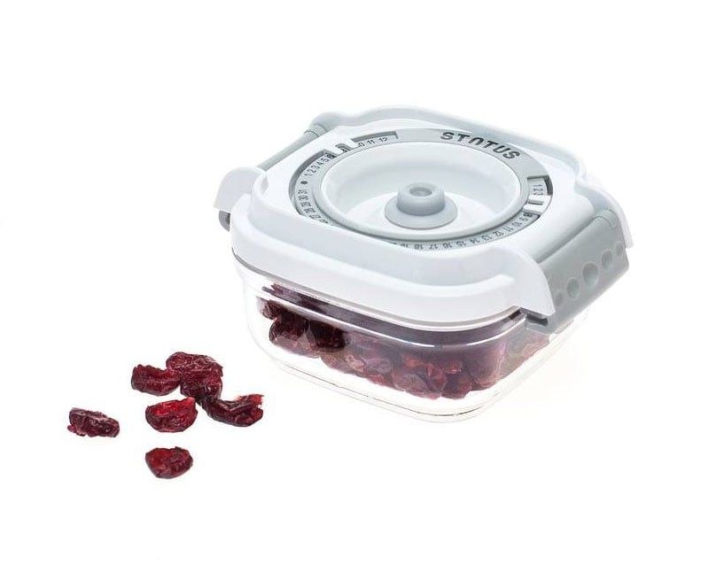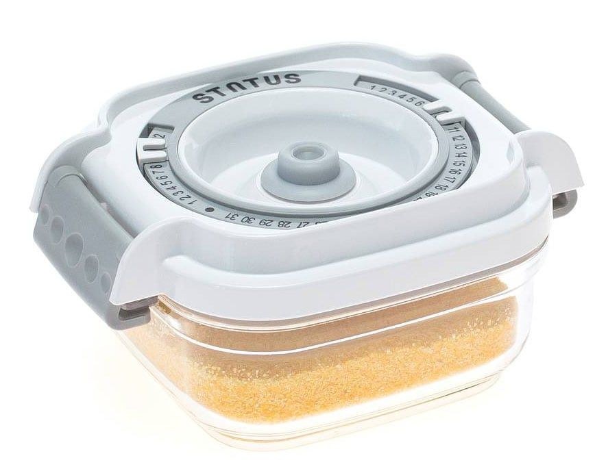 • της STATUS για Ζάχαρη &καφέΒότανα, μπισκότα, κέικΣαλάμι, τυρί, σκόρδοΓλυκά, περίσσεια τροφίμωνΣάλτσες και πολλά άλλαΧρήσηΑφαιρέστε τον αέρα από το δοχείο αεροστεγούς φύλαξης χρησιμοποιώντας την αντλία ή τη συσκευή συντήρησης τροφίμων σε κενό αέρος (FV500 ή SV2000)Για να ανοίξετε το δοχείο πατήστε τη βαλβίδα στο κέντρο του δοχείουΤο ημερολόγιο στο καπάκι σας επιτρέπει να σημειώνετε την ημερομηνία λήξης του προϊόντος ή την ημερομηνία που αεροστεγούςΜαρινάρισμα Το κρέας, τα πουλερικά και το ψάρι μαρινάρονται σε μερικά λεπτά στα δοχεία της STATUS αφού η διαδικασία του αεροστεγούς κλεισίματος και της αρνητικής πίεσης που δημιουργείται μέσα στα δοχεία επιτρέπει στη μαρινάρα να εισχωρήσει στο φαγητό πολύ πιο εύκολα και γρήγορα, έτσι, η οι γεύσεις της μαρινάρας έχουν πιο ωραία, φρέσκια και έντονη γεύση.