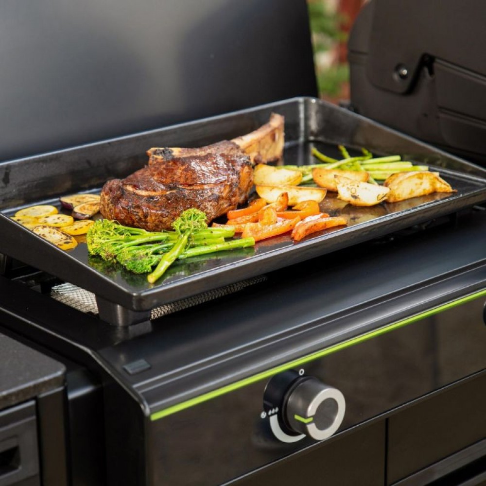Η επιφάνεια ψησίματος από μασίφ χυτοσίδηρο εξασφαλίζει ομοιόμορφη κατανομή θερμότητας και τέλειο αποτέλεσμα.