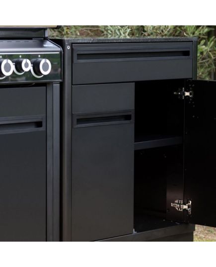 Όλες οι μονάδες είναι κατασκευασμένες από ανοξείδωτο χάλυβα με επίστρωση πούδρας, εξαιρετικά ανθεκτικές στις καιρικές συνθήκες, με πάγκους από HPL και διακόσμηση ξύλου. Οι αποθηκευτικοί χώροι διαθέτουν συρτάρια και πόρτες με μηχανισμούς soft-close, καθώς και θέσεις για φιάλες υγραερίου έως 11 κιλών.