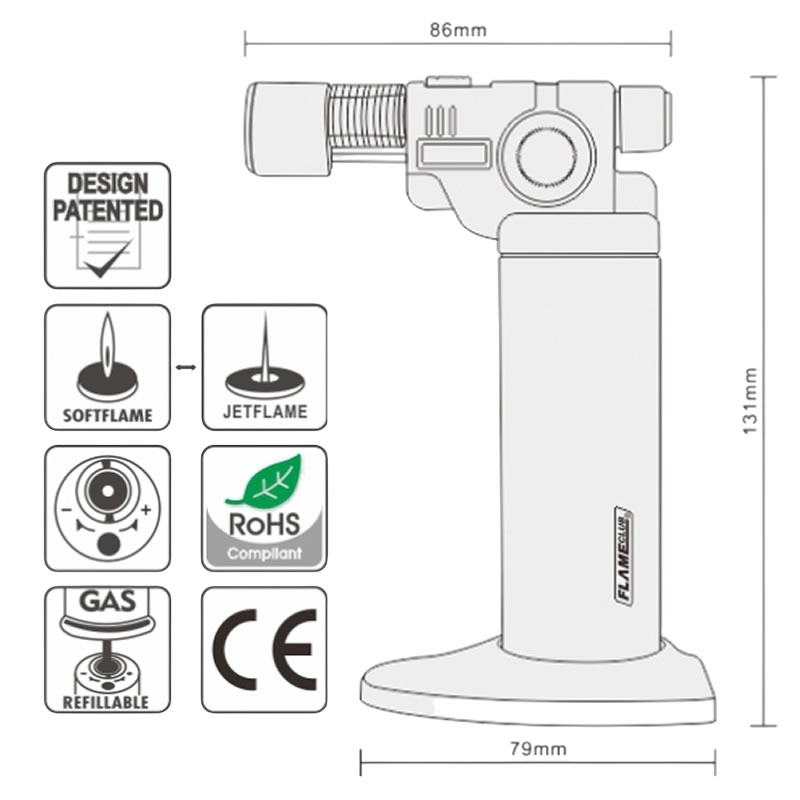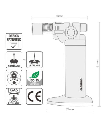 38610 (code)Επαγγελματικό Φλόγιστρο ζαχαροπλαστικής MT-80 FlameClub. Convenient to use with its mini gun-like shape and ignition button at the front. Two powerful flames (soft and jet), flame-lock switch and can be customized to include a silicon container at the back.