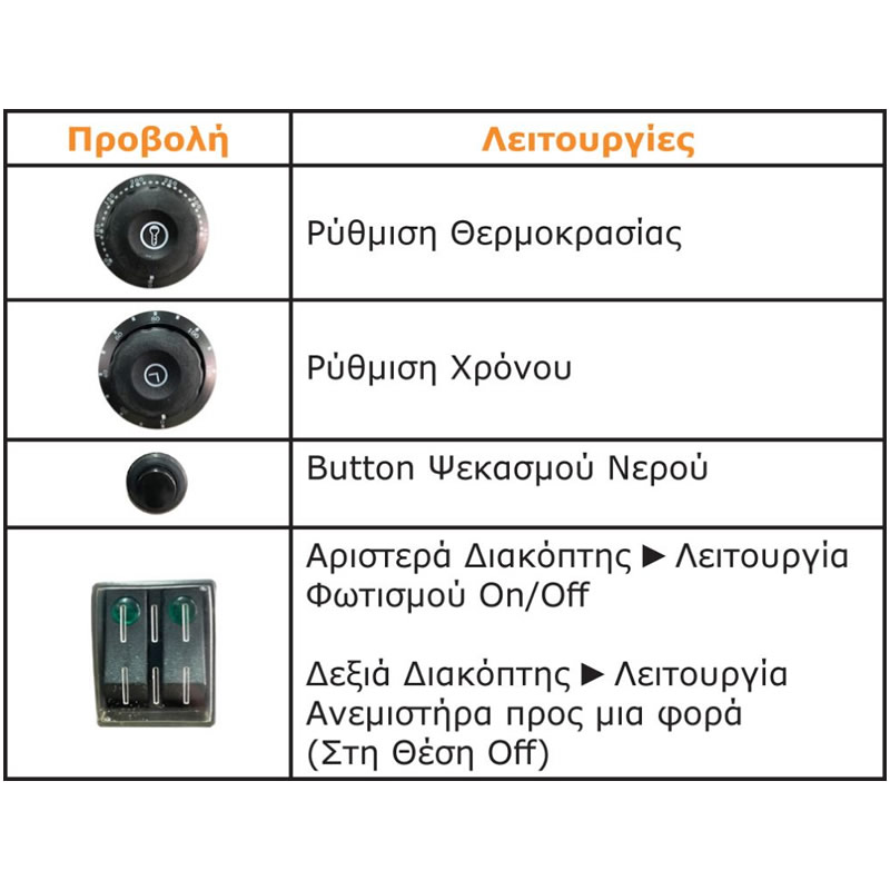- Με ένα μοτέρ και διακόπτες για ρύθμιση θερμοκρασίας και χρόνου.
