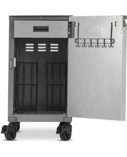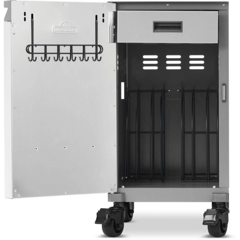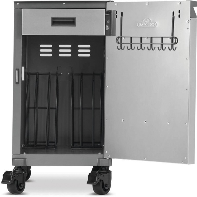 Χάρη στους τέσσερις τροχούς με σύστημα κλειδώματος, μετακινείται με ευκολία και ασφάλεια, λειτουργώντας σαν ενιαία μονάδα με τη ψησταριά σας. Το κρυφό επάνω συρτάρι σάς δίνει άμεση πρόσβαση στα βασικά εργαλεία, ενώ το εσωτερικό σύστημα διαχωρισμού και οι ενσωματωμένοι γάντζοι επιτρέπουν να προσαρμόσετε την αποθήκευση ανάλογα με τις ανάγκες σας.