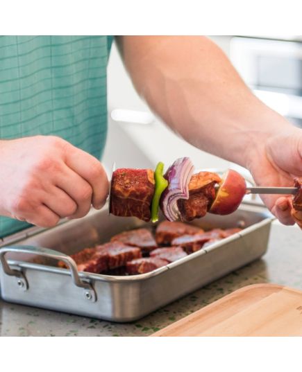 Αυτό το προϊόν σας επιτρέπει να φτιάξετε το δικό σας Kebab. Απλά καρφώνετε μερικά λαχανικά και κρέας και είστε έτοιμοι! Χρησιμοποιήστε το GRILL + Skewers μόνοι σας ή σε συνδυασμό με το GRILL + Roasting Dish (# 140014) για να καπνίσετε, να γεμίσετε ή να μαρινάρετε το φαγητό. Τα ενσωματωμένα ρυθμιστικά επιτρέπουν να αφαιρείτε εύκολα το μαγειρεμένο φαγητό. Είναι κατασκευασμένα από ανοξείδωτο ατσάλι και είναι ασφαλή στο πλυντήριο πιάτων.