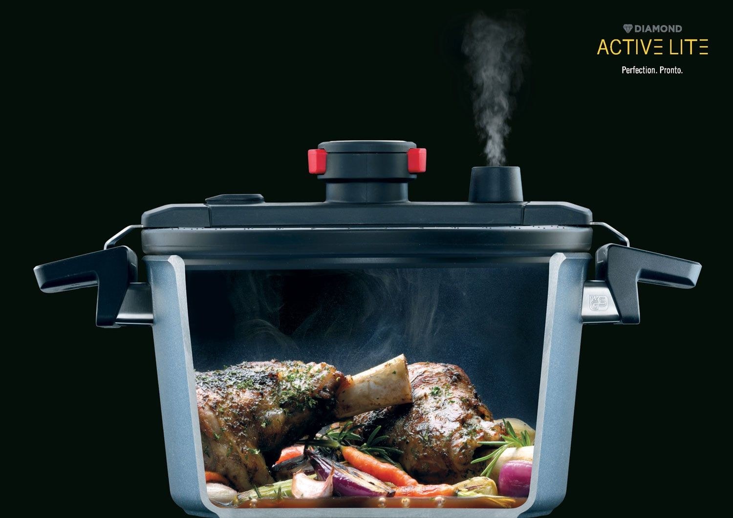 Κατά κανόνα, οι αντικολλητικές χύτρες Diamond Active Lite μπορούν να μειώσουν το χρόνο μαγειρέματος κατά 50% σε σύγκριση με τις συμβατικές μεθόδους μαγειρέματος ενώ χάρη στο μοναδικό σχεδιασμό τους, μπορείτε να αφαιρέσετε το καπάκι απο τη χύτρα ταχύτητας οποιαδήποτε στιγμή κατά τη διάρκεια του μαγειρέματος για να προσθέσετε υλικά και καρυκεύματα.