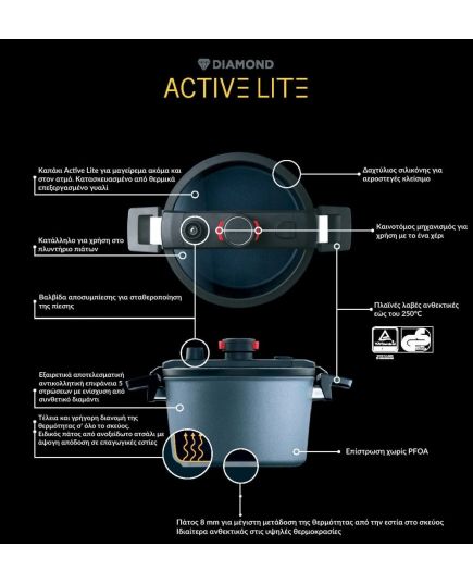 Με τον ειδικό σχεδιασμό Diamond Active Lite, το νερό μέσα στη χύτρα θερμαίνεται μόλις πάνω από 100 ° C. Αυτό παράγει μια μικρή ποσότητα υπερπίεσης στην κατσαρόλα, μειώνοντας σημαντικά το χρόνο βρασμού / μαγειρέματος με παρόμοιο τρόπο με μια χύτρα ταχύτητας. Οι χρόνοι μαγειρέματος, εξαρτώνται από πολλούς παράγοντες, όπως το πλήθος των συστατικών και η ισχύς της εστίας.
