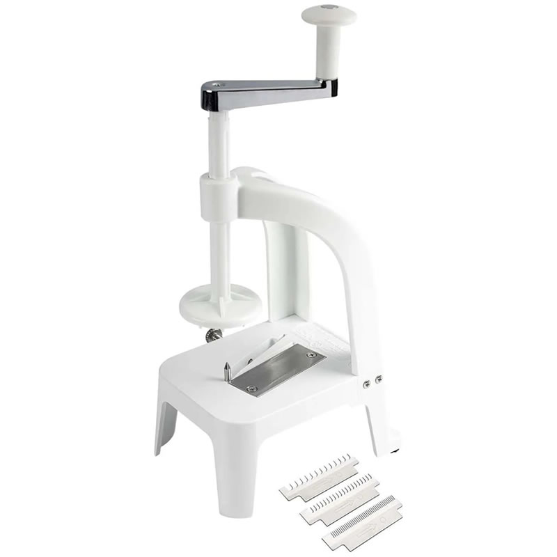 57373 (code) Το λευκό κάθετο spiralizer λαχανικών BN-8W από την Benriner είναι μια κομψή και λειτουργική συσκευή που επιτρέπει τη δημιουργία τέλειων σπειροειδών σχημάτων από λαχανικά, καθώς και λωρίδων τόσο λεπτών που μοιάζουν με νήματα. Περιλαμβάνονται 3 εξαιρετικά αιχμηρές λεπίδες: μία ευθεία λεπίδα και δύο πριονωτές λεπίδες με διαφορετικές αποστάσεις μεταξύ των δοντιών - 1mm, 2,5mm και 4mm.