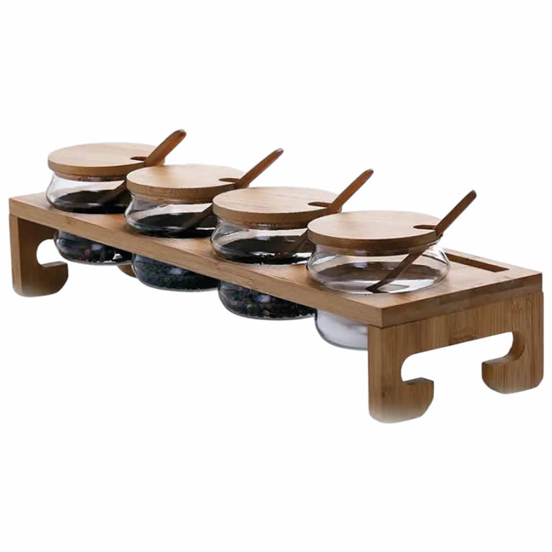 ΞΥΛΙΝΗ ΒΑΣΗ ΜΠΑΜΠΟΥ 4 ΘΕΣΕΩΝ ΜΕ BOROSILICATE ΒΑΖΑ ΚΑΙ ΚΟΥΤΑΛΙΑ ΣΕΡΒΙΡΙΣΜΑΤΟΣ