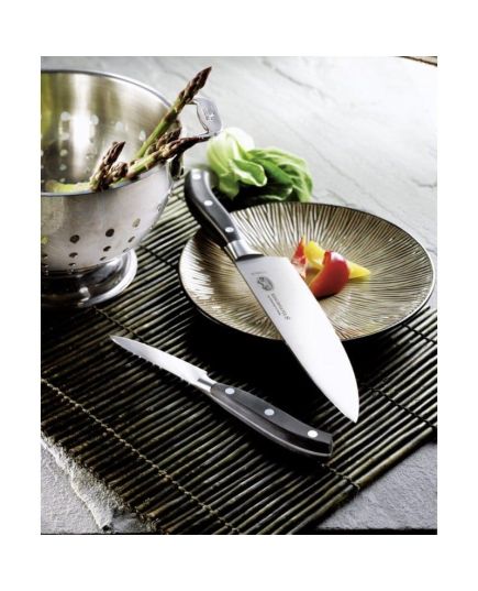 Το Μαχαίρι Chef έχει ίσως τις περισσότερες χρήσεις από κάθε άλλο μαχαίρι της κουζίνας, αφού μπορείτε να το χρησιμοποιήσετε για να κόψετε μεγάλες μερίδες, να ψιλοκόψετε ή να τεμαχίσετε από λαχανικά και φρούτα μέχρι κρέας και ψάρι. Η φαρδιά του λάμα και η κυρτή του λεπίδα το κάνουν ιδανικό για γρήγορο ψιλοκόψιμο μέσω της γνωστής λικνιστής κίνησης. Το πάχος της λάμας στη ράχη είναι αρκετό για να σας δώσει το βάρος και τη δύναμη που χρειάζεστε, ενώ το μήκος της καλύπτει ένα μεγάλο εύρος καθημερινών εργασιών. Η συλλογή Grand Maitre έχει να κάνει με την ισορροπία. Κάθε μαχαίρι σε αυτή τη σειρά είναι μονοκόμματο, έχει δηλαδή ομοιόμορφα σκληρυνθεί και σφυρηλατηθεί απο 1 κομμάτι μέταλλο. Εξαιτίας αυτού, η μετάβαση από τη λεπίδα στη λαβή γίνεται κομψά. Η λαβή είναι εργονομικά σχεδιασμένη ώστε να είναι άνετη ακόμα και μετά απο μεγάλο χρονικό διάστημα συνεχούς χρήσης.