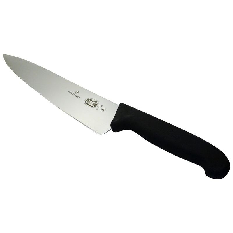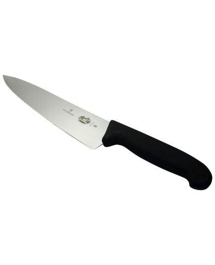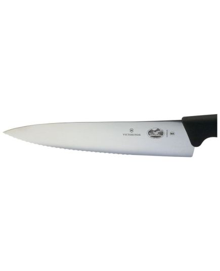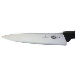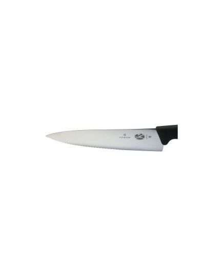 19756 (code) Μαχαίρι Fibrox Carving οδοντωτό 5.2033.25 από την Ελβετική εταιρία Victorinox . Κατάλληλο για να κόβει κρέας ή ψάρι αλλά και για κόψιμο λαχανικών. Η Λαβή της ειναι FIBROX σε μαύρο χρώμα από πολυαμίδιο, πατενταρισμένη με τις γνήσιες λαβές της Victorinox προσφέροντας ένα ευχάριστο και αντιολισθητικό κράτημα