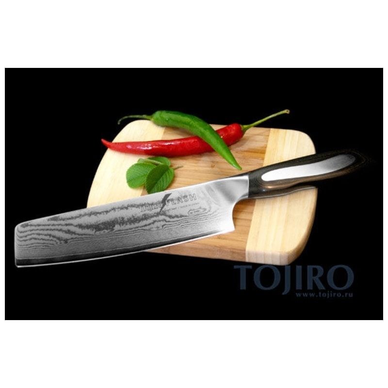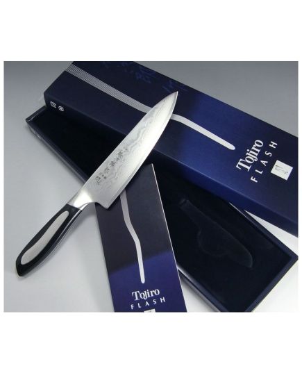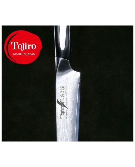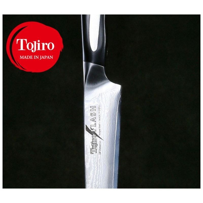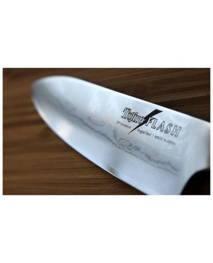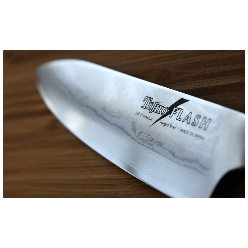 Η λάμα του Flash της Tojiro είναι κατασκευασμένη από δαμασκηνό ανοξείδωτο ατσάλι, φημισμένο στους αιώνες για την αιχμηρότητα και ανθεκτικότητά του, αλλά και για την εντυπωσιακή όψη που δημιουργούν τα χαρακτηριστικά "νερά" του και κάνουν κάθε μαχαίρι κυριολεκτικά μοναδικό. Πιο συγκεκριμένα, ο πυρήνας της λάμας αποτελείται από το καινοτόμο γιαπωνέζικο κράμμα ανοξείδωτου ατσαλιού VG10, χαρακτηριστικό για τη σκληρότητά του χάρη στο κοβάλτιο που περιέχει, το οποίο περικλείεται από ξεχωριστά στρώματα δαμασκηνού ατσαλιού, ενισχύοντας έτσι τη σκληρότητα και την ανθεκτικότητα του μαχαιριού. Κάθε μαχαίρι της σειράς ακονίζεται στο χέρι από έμπειρους Γιαπωνέζους τεχνίτες και στις δύο πλευρές του στις 15°, προκειμένου να παραλάβετε ένα απόλυτα αιχμηρό μαχαίρι.