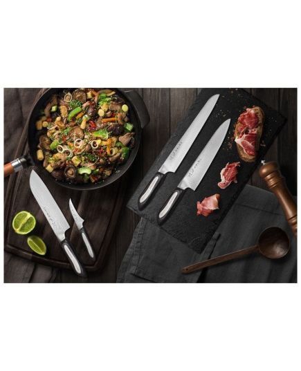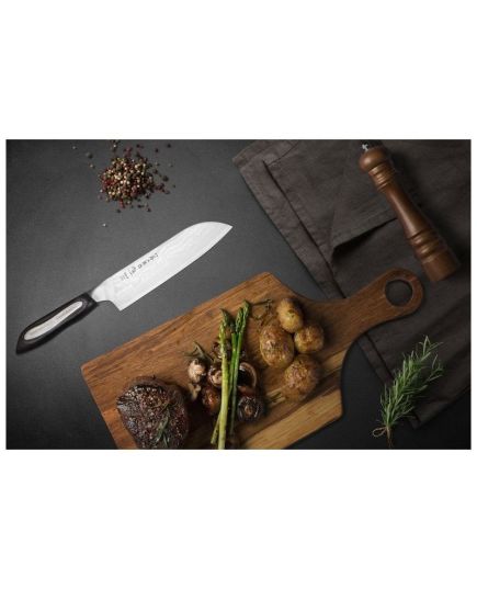 Ένα μαχαίρι που θα αγαπήσετε λόγω της γνωστής Iαπωνικής αιχμηρότητας και της κατασκευής από δαμασκηνό ατσάλι, αλλά και λόγω της καινοτομίας όσον αφορά τον σχεδιασμό του αφού η λαβή του είναι φτιαγμένη ώστε να προσαρμόζεται στις ανάγκες σας και να προσφέρει άνετο και γερό κράτημα