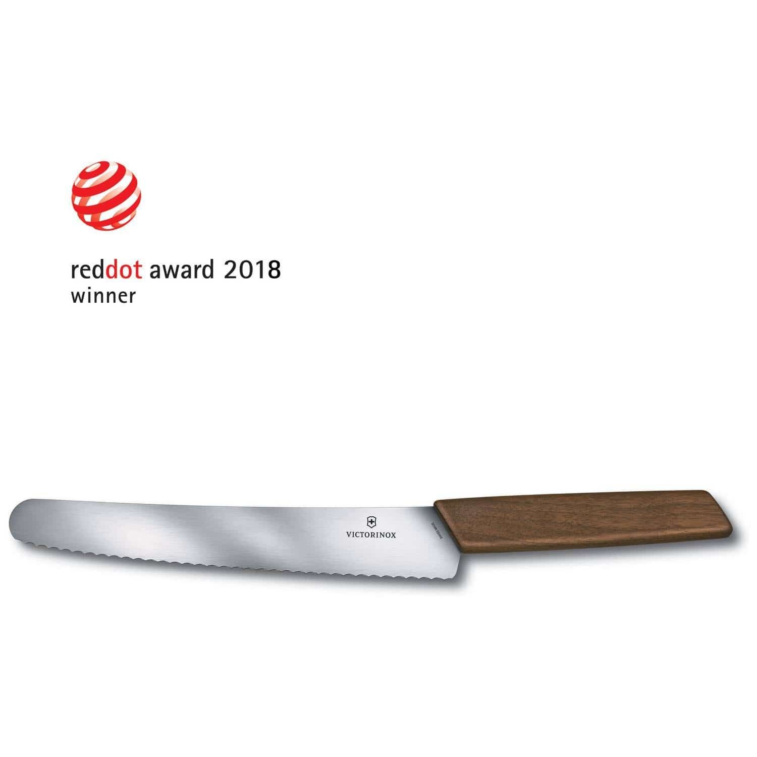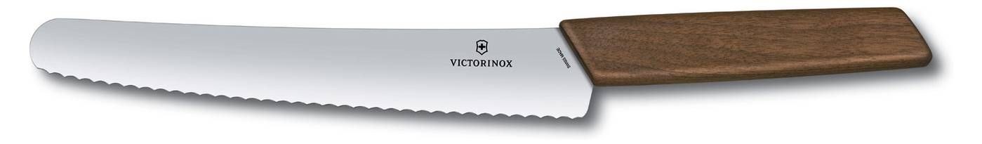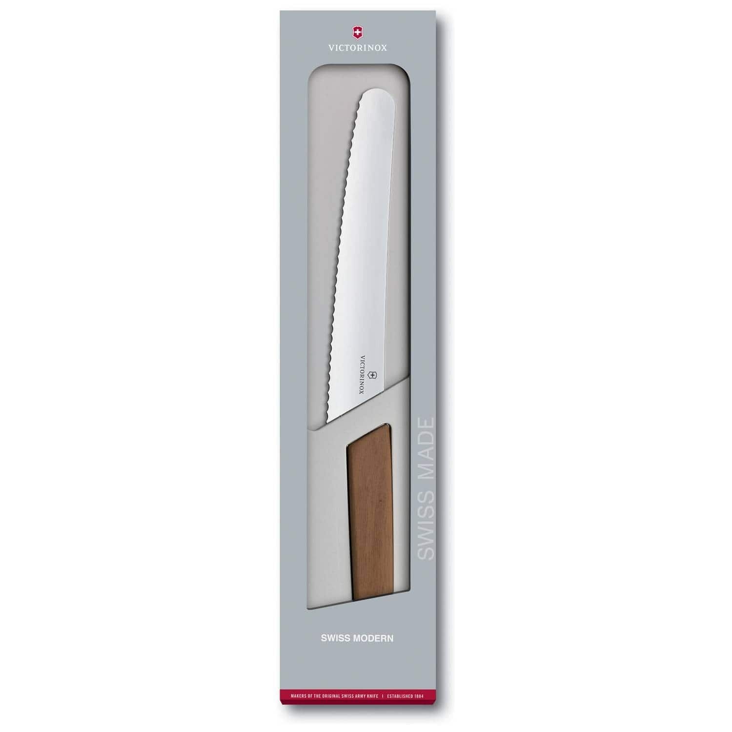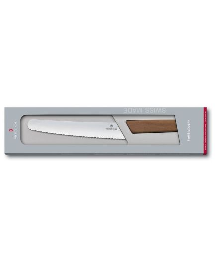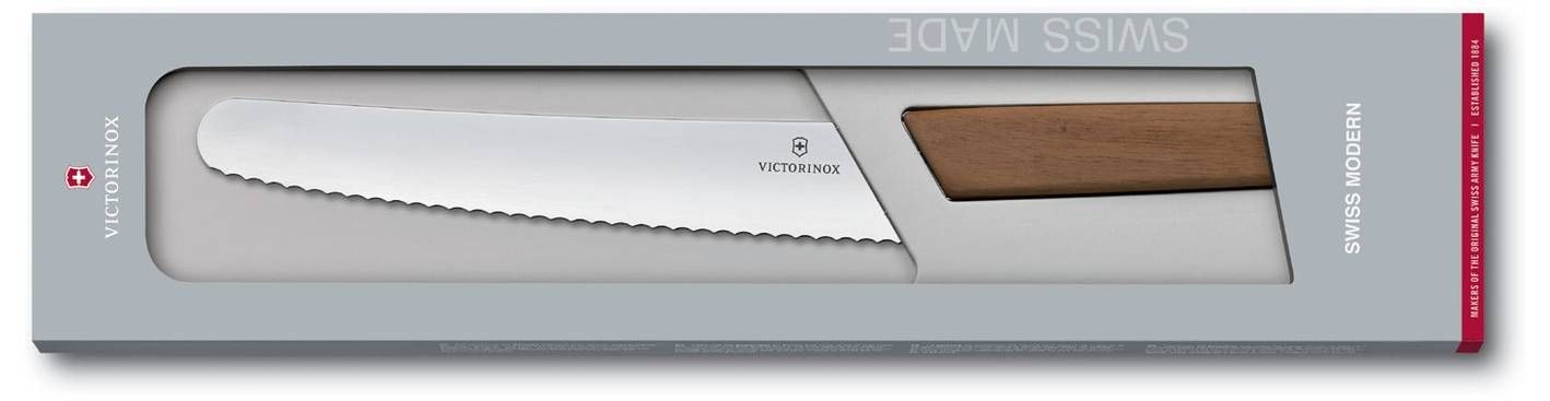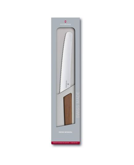 Το μαχαίρι ψωμιού της Ελβετικής εταιρίας Victorinox είναι ιδανικό για όλα τα τρόφιμα με κρούστα, καθώς η οδοντωτή του λάμα επιτρέπει στο μαχαίρι να διαπεράσει την εξωτερική κρούστα χωρίς να τη σπάσει. Έχει μεγάλο μήκος και μπορεί να χρησιμοποιηθεί σε όλα τα τρόφιμα με σκληρή εξωτερική επιφάνεια, ακόμα και σε γλυκά. Η σειρά Swiss Modern της Victorinox αποτελεί τον συνδυασμό του στυλ & της αποστελεσματικότητας. Κάθε μαχαίρι της σειράς αποτελείται από ανθεκτικό στη φθορά ανοξείδωτο ατσάλι και συνδυάζεται με μια πλούσια σε ίνες, μοναδική λαβή από ξύλο ευρωπαϊκής καρυδιάς. Εργονομικά σχεδιασμένο για απόλυτη άνεση και ταυτόχρονα ελαφρύ στο χέρι αυτό το μαχαίρι αποτελεί ό,τι πιο σύγχρονο έχει να παρουσιάσει η Victorinox στα εργαλεία κουζίνας.