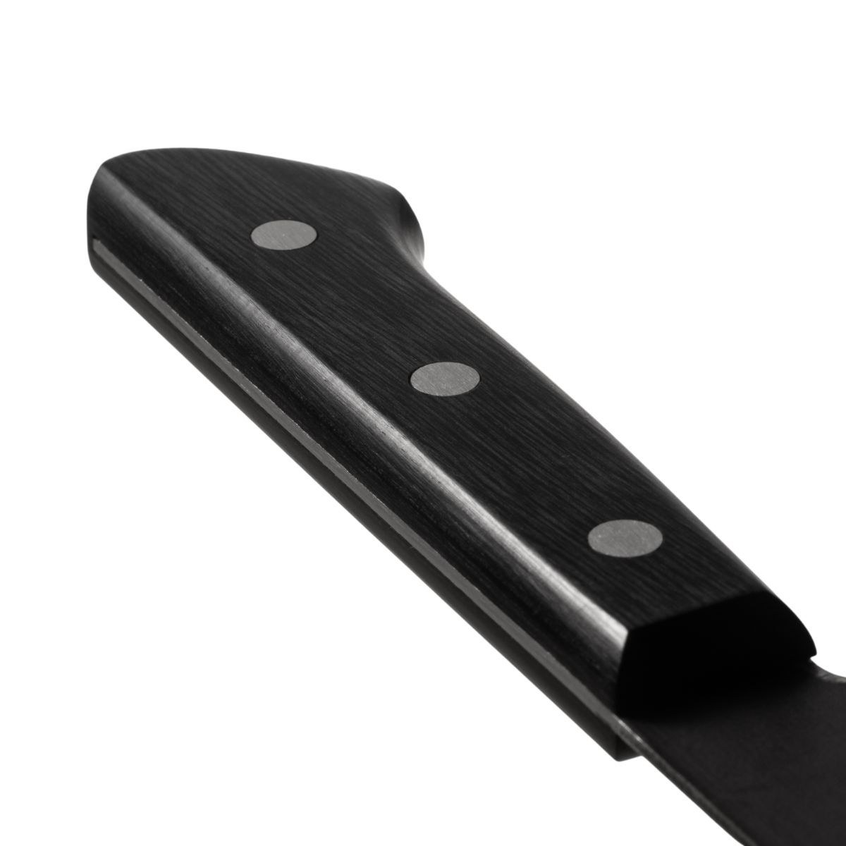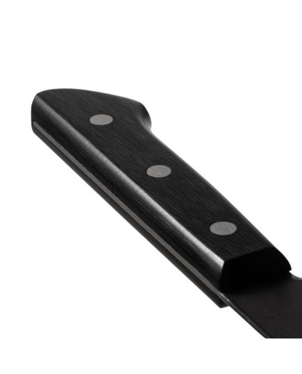 Το πρώτο μέρος του μαχαιριού με το οποίο έρχεστε σε επαφή είναι η λαβή του. Η λαβή της σειράς Tojiro Basic είναι κατασκευασμένη από ενισχυμένο πλαστικοποιημένο ξύλο (pakkawood), σκουρόχρωμο με πανέμορφες λεπτομέρειες εξαιρετικά ανθεκτικό στο νερό σε σύγκριση με το παραδοσιακό ξύλο. Το σχήμα της λαβής προσφέρει σταθερό κράτημα στο χέρι και το μαχαίρι δεν πρόκειται να γλιστρήσει. Τα 3 πριτσίνια από ανοξείδωτο ατσάλι εγγυώνται ακόμα μεγαλύτερη σταθερότητα.
