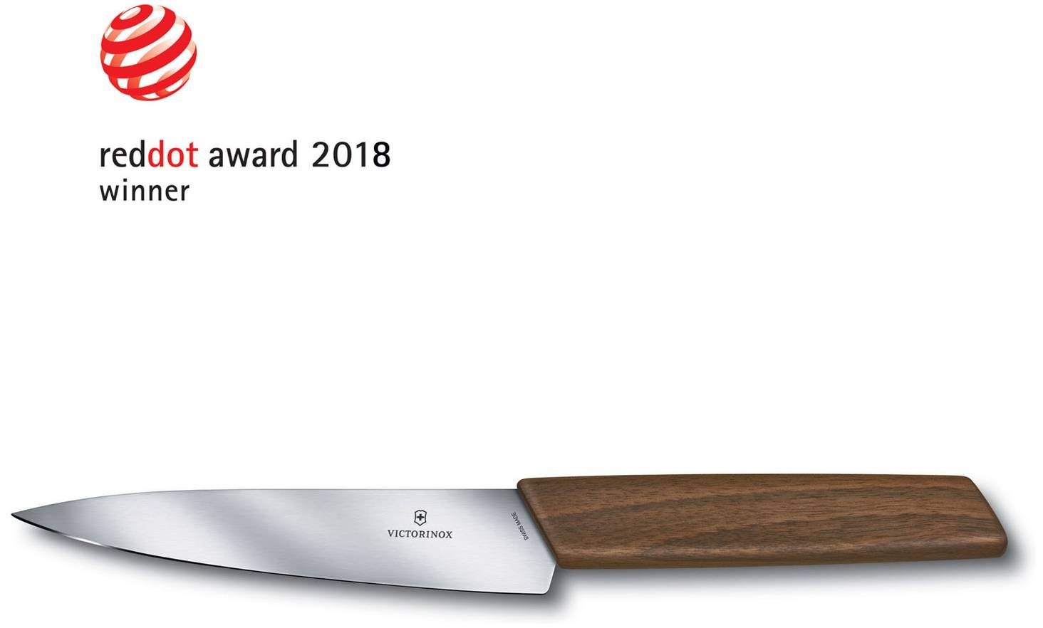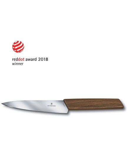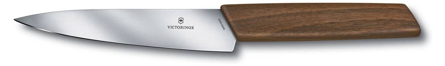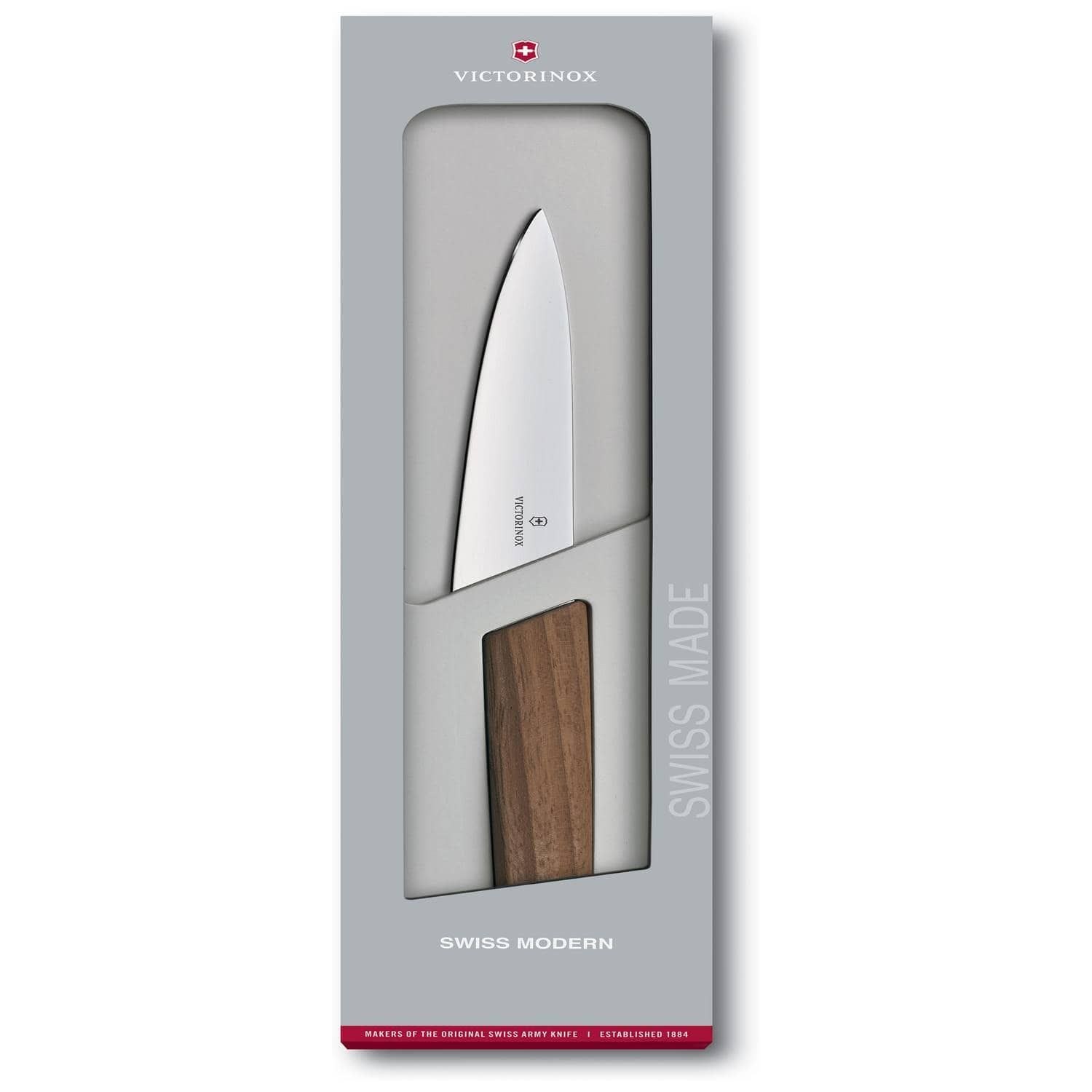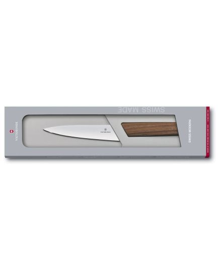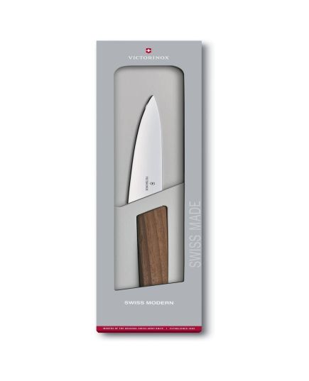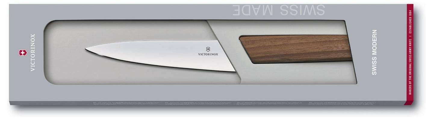 Η σειρά Swiss Modern της Victorinox αποτελεί τον συνδυασμό του στυλ & της αποστελεσματικότητας. Κάθε μαχαίρι της σειράς αποτελείται από ανθεκτικό στη φθορά ανοξείδωτο ατσάλι και συνδυάζεται με μια πλούσια σε ίνες, μοναδική λαβή από ξύλο ευρωπαϊκής καρυδιάς. Εργονομικά σχεδιασμένο για απόλυτη άνεση και ταυτόχρονα ελαφρύ στο χέρι αυτό το μαχαίρι αποτελεί ό,τι πιο σύγχρονο έχει να παρουσιάσει η Victorinox στα εργαλεία κουζίνας. Τα προϊόντα Victorinox είναι πρακτικά, έχουν διάρκεια και λειτουργική αισθητική.