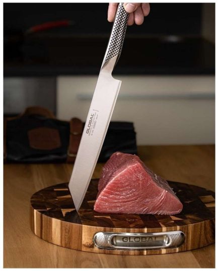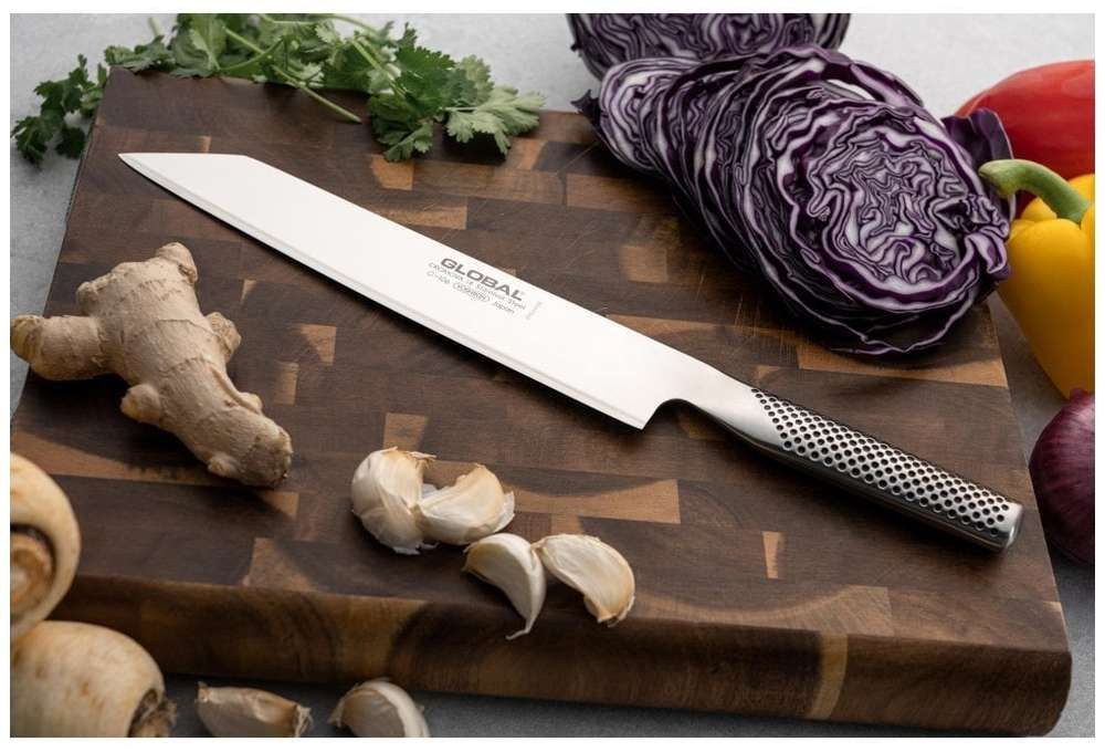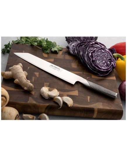 57246 (code) Special edition by Global! Η Global σχεδίασε και προχώρησε στην κατασκευή μιας έκδοσης του Kiritsuke με διπλή κόψη στη σειρά Classic, δημιουργώντας το πολύ ευέλικτο μαχαίρι Kiritsuke G-106. Η άκρη της λεπίδας είναι ιδιαίτερα κατάλληλη για λεπτομερείς τεμαχισμούς και ψιλοκοπήματα. Το μαχαίρι Kiritsuke είναι ένα παραδοσιακό ιαπωνικό μαχαίρι κουζίνας που λόγω της μοναδικής του σχεδίασης και της απαιτούμενης δεξιοτεχνίας, θεωρείται σύμβολο υψηλής μαγειρικής τέχνης και συχνά χρησιμοποιείται μόνο από έμπειρους σεφ. Διαθέτει μακριά και πλατιά λεπίδα, με ευθεία κόψη και αιχμηρή άκρη που θυμίζει ξίφος. Το σχήμα της λεπίδας επιτρέπει ακριβείς, καθαρές κοπές και η επίπεδη κόψη της διευκολύνει τις λεπτές, λεπτομερείς εργασίες, όπως το φιλετάρισμα ψαριού και ψιλοκόψιμο λαχανικών.
