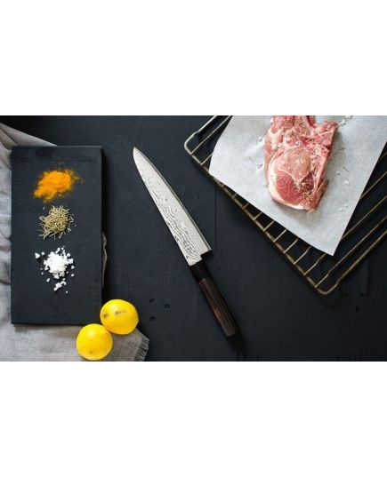 - Λάμα με 63 στρώσεις από δαμασκηνό ανοξείδωτο ατσάλι και πυρήνα από VG10