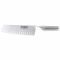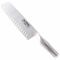 57242 (code) Το μαχαίρι G-81 της Global είναι εμπνευσμένο από τα παραδοσιακά ιαπωνικά μαχαίρια Usuba, δημοφιλή μεταξύ των επαγγελματιών σεφ στην Ιαπωνία ως εξειδικευμένα μαχαίρια λαχανικών. Οι αυλακώσεις στη λεπίδα δημιουργούν θύλακες αέρα μεταξύ της επιφάνειας της λεπίδας και του τροφίμου, εμποδίζοντας τα λαχανικά να κολλήσουν στη λεπίδα καθώς κόβετε. To μαχαίρι Nakiri είναι γνωστό και ως μαχαίρι λαχανικών στην Ιαπωνική κουζίνα. Βασισμένο στον Ιαπωνικό τρόπο κοπής, αυτό το μαχαίρι χαρακτηρίζεται από την ορθογώνια, ευθυτενή λεπίδα του, η οποία είναι ειδικά σχεδιασμένη για την αποτελεσματική κοπή, το ψιλοκόψιμο και τον τεμαχισμό λαχανικών. Η επίπεδη λεπίδα επιτρέπει την πλήρη επαφή με το ξύλο κοπής, καθιστώντας το ιδανικό για ακριβείς, καθαρές κοπές χωρίς κούνημα. Ο σχεδιασμός του εξασφαλίζει ευκολία στη χρήση, τόσο για τους επαγγελματίες σεφ όσο και για τους οικιακούς μάγειρες κατά την προετοιμασία πιάτων με βάση τα λαχανικά.