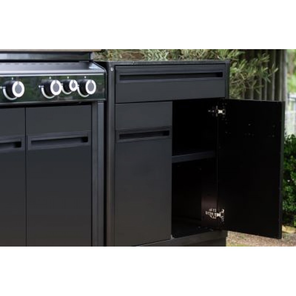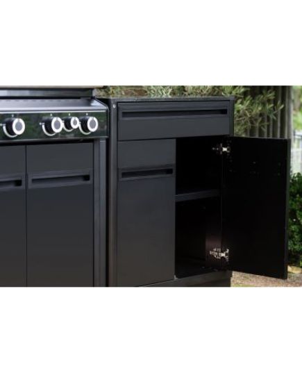 Η μονάδα ντουλαπιού αποτελεί μέρος του αρθρωτού συστήματος εξωτερικής κουζίνας HEAT και προσφέρει εξαιρετική αποθηκευτική ικανότητα. Το εσωτερικό ράφι επιτρέπει την οργάνωση μεγάλων σκευών όπως κατσαρόλες και δίσκοι ψησίματος, ενώ το ευρύχωρο συρτάρι εξυπηρετεί στην τακτοποίηση μικρότερων εργαλείων. Η στιβαρή κατασκευή και τα ανθεκτικά υλικά εξασφαλίζουν πλήρη προστασία από τις καιρικές συνθήκες, καθιστώντας τη μονάδα ιδανική για χρήση όλο τον χρόνο. Συνδυάζεται με άλλα στοιχεία της σειράς για τη δημιουργία μιας πλήρως εξατομικευμένης και λειτουργικής εξωτερικής κουζίνας.