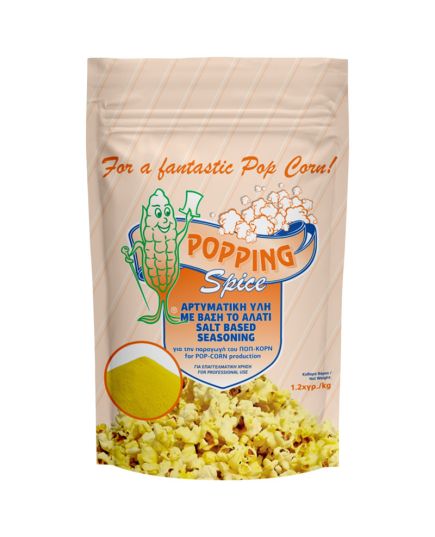 Αν επιθυμείτε να δώσετε στο ποπ κορν που παρασκευάζετε έξτρα γεύση, χρώμα και άρωμα η λύση είναι το POPPING SPICE. Πρόκειται για μπαχαρικό ειδικού τύπου, που αντικαθιστά πλήρως το αλάτι και ενισχύει τη γεύση, το χρώμα και το άρωμα του ποπ κορν. Το παρασκευάζουμε από θαλασσινό λεπτόκοκκο αλάτι, φυσική χρωστική και άρωμα συμβατό με τα αρώματα όλων των τύπων βουτύρου που παράγουμε. Η ποσότητα της συσκευασίας είναι αρκετή για την μετατροπή ενός σάκου καλαμποκιού (22,7kg) σε ποπ κορν.