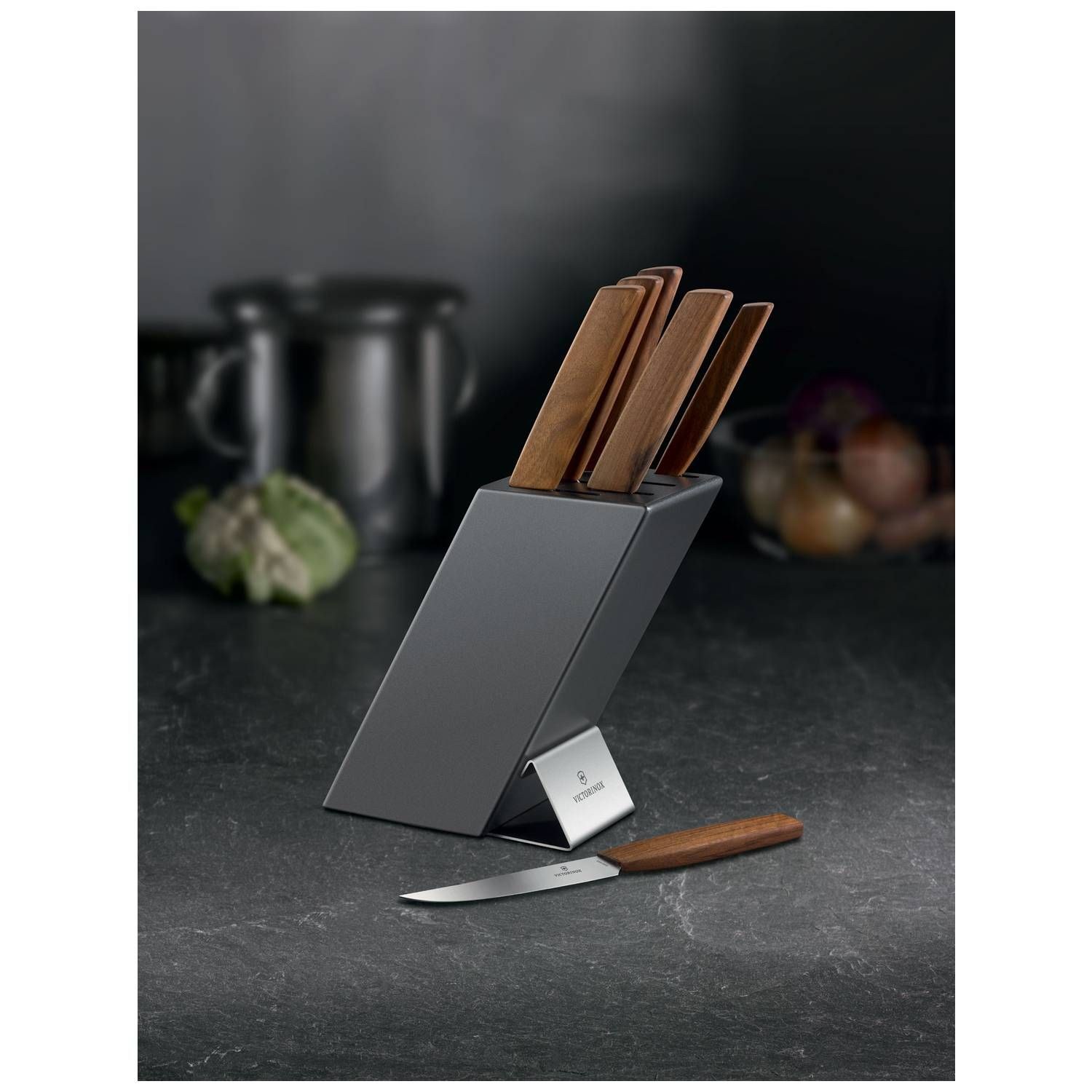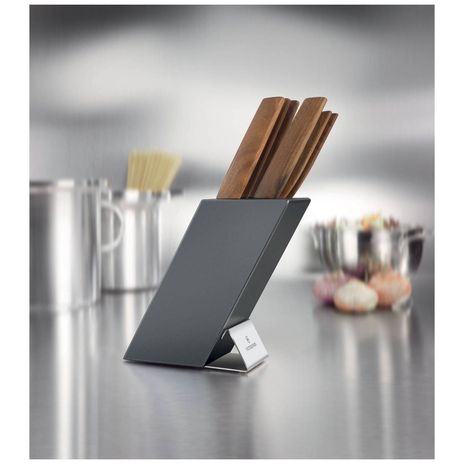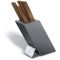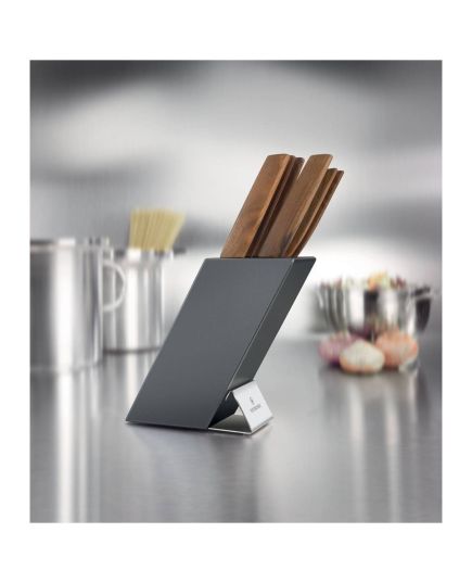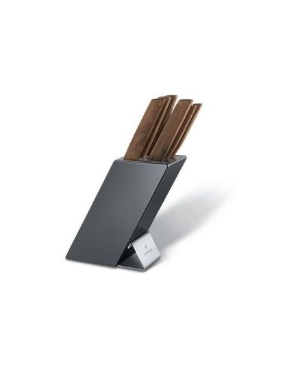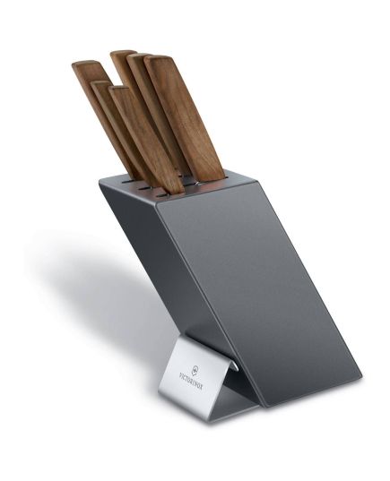 Το μπλοκ μαχαιριών Victorinox Swiss Modern περιλαμβάνει: Μαχαίρι Γενικής Χρήσης 15 εκ. Μαχαίρι Σεφ με έξτρα φαρδιά λάμα 20 εκ. Μαχαίρι Σεφ 22 εκ. Μαχαίρι Santoku 17 εκ. Μαχαίρι Ψωμιού 22 εκ. Πιρούνα 15 εκ. Εξαιρετικά πρακτικό, αλλά και όμορφο, μπλοκ για τα μαχαίρια σας. Τώρα μπορείτε να φυλάτε τα μαχαίρια σας εύκολα και με ασφάλεια εκεί που τα χρειάζεστε. Μάλιστα, μπορείτε να το χρησιμοποιείτε για να φυλάτε τα μαχαίρια σας και κατά τη διάρκεια της προετοιμασίας του φαγητού, ανάμεσα δηλαδή στις χρήσεις τους. Όταν χρειάζεται, το μπλοκ και το εσωτερικό του μπορεί να καθαριστεί με νερό.