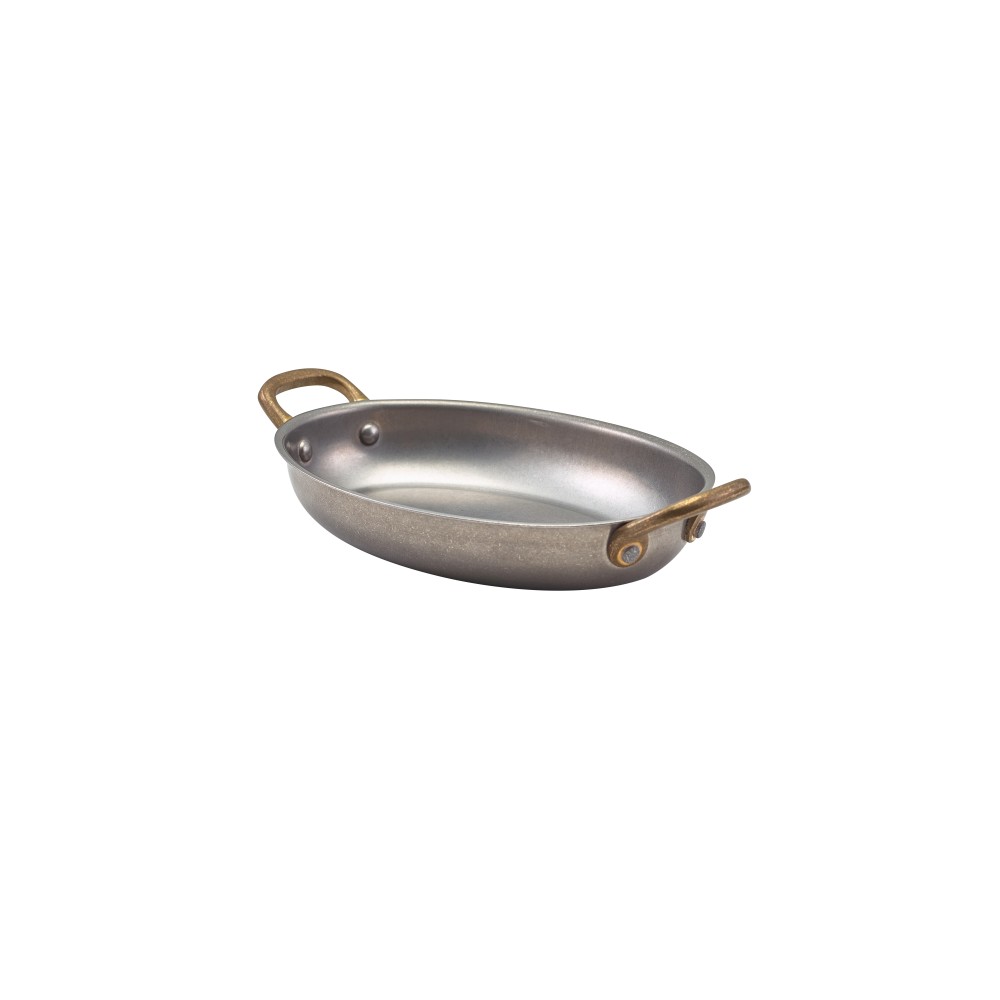 Πιατέλα Ανοξείδωτη βαρέως τύπου σε Vintage matt satin φινίρισμα με μπρούτζινα χερούλια. Οι ωφέλιμες διαστάσεις της πιατέλας είναι 21x16x3. 5 CM CM. Οι διαστάσεις με τα χερούλια είναι 24,5x16x3. 5 CM CM