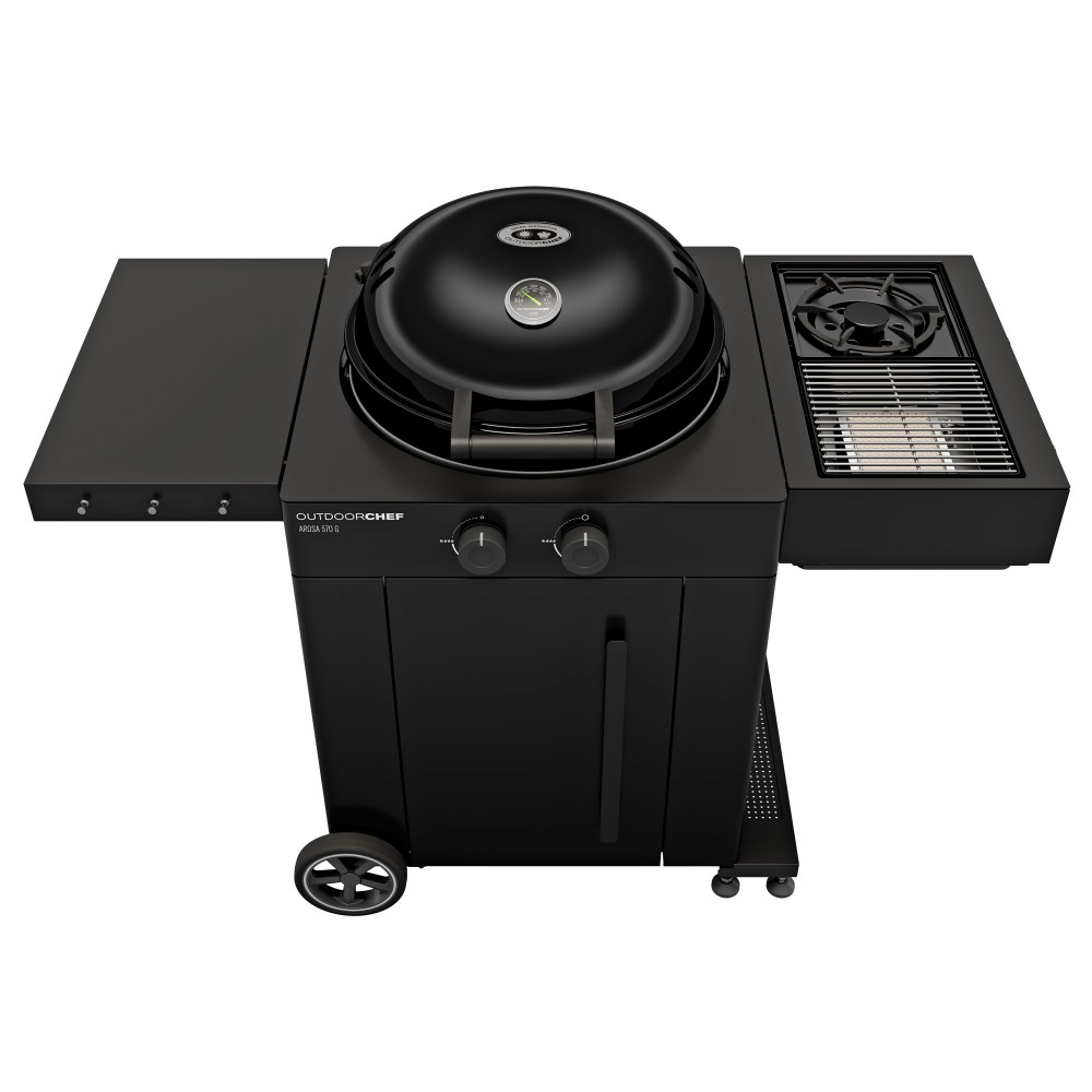 Αυτό το μπάρμπεκιου με σχήμα kettle διαθέτει το χαρακτηριστικό βελτιωμένο και μοντέρνο σχεδιασμό της OUTDOORCHEF. Η επένδυση από χάλυβα με επίστρωση πούδρας σε δύο αποχρώσεις του γκρι καλύπτει 4 πλευρές και παρέχει μια γερή βάση για το μπάρμπεκιου. Μια συμπαγής άρθρωση από αλουμίνιο από χυτοσίδηρο δημιουργεί μια εξαιρετική αίσθηση κατά το άνοιγμα και το κλείσιμο του καπακιού. Με το μοναδικό σύστημα διοχέτευσης στον βραστήρα και τα ειδικά ανεπτυγμένα πρόσθετα Blazing/Cooking Zone Kit Plus, που διαθέτει αυτό το μοντέλο, είναι κατάλληλο για την προετοιμασία όλων των ειδών πιάτων μπάρμπεκιου και άλλων κλασικών μαγειρικών σε εξωτερικούς χώρους. Κάνοντας το AROSA 570 G EVO Plus Black μια κουζίνα εξωτερικού χώρου που δεν γνωρίζει όρια.