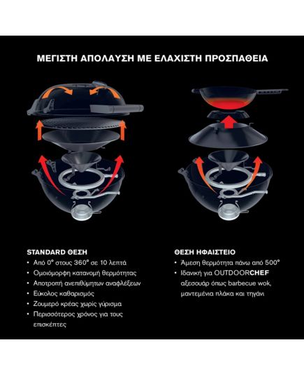 Από κάπνισμα στους 80 βαθμούς έως χαμηλό και αργό μαγείρεμα στους 110 έως 130 βαθμούς ή τραγανή πίτσα στους 360 βαθμούς, όλα είναι πιθανά. Δεν χρειάζεται να ανάβετε το φαγητό στη σχάρα. Εάν θέλετε να αυξήσετε πραγματικά τη θερμοκρασία για το barbecue wok ή την μαντεμένια πλάκα, απλώς περιστρέψτε τη χοάνη στη θέση του ηφαιστείου. Στη συνέχεια, η θερμότητα συγκεντρώνεται στους 500 βαθμούς.