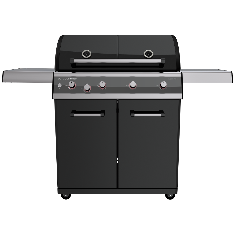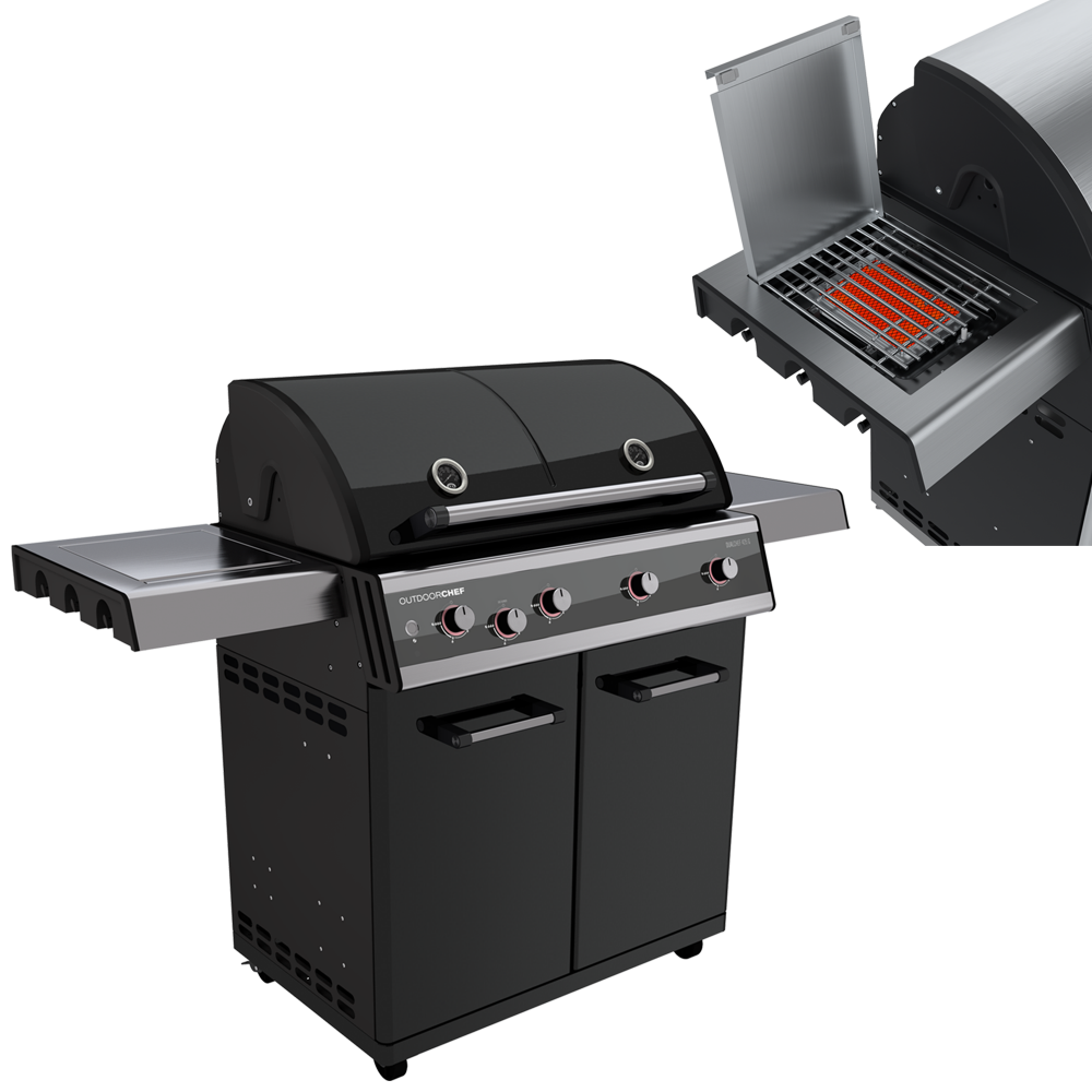 27006 (code) Το σήμα κατατεθέν της ψησταριάς υγραερίου DUALCHEF ref. 18.700.17, από την OUTDOORCHEF είναι το σύστημα Dual Gourmet (DGS ®), που αναπτύχθηκε και κατοχυρώθηκε με δίπλωμα ευρεσιτεχνίας στην Ελβετία. Αυτή η τεχνολογία συνδυάζει δύο ζώνες θερμοκρασίας που χωρίζονται με το Zone Divider κάτω από το καπάκι, με τέλεια κατανομή θερμότητας. Από τη μία πλευρά μπορείτε να ψήσετε σε υψηλές θερμοκρασίες πάνω από 360 βαθμούς, ενώ από την άλλη μεγάλα κομμάτια κρέατος ή ψαριού ψήνονται σε θερμοκρασίες από 80 βαθμούς. Οι υψηλής ποιότητας σχάρες από μαντέμι, που εγγυώνται τη βέλτιστη αποθήκευση θερμότητας, εξασφαλίζουν ένα όμορφο branding της μπριζόλας σας. Επιπλέον, τα μοντέλα OUTDOORCHEF DUALCHEF διαθέτουν HEAT DIFFUSER, ο οποίος κατευθύνει τη θερμότητα στο περιστρεφόμενο καλάθι (δεν περιλαμβάνεται στο πακέτο) και έτσι μειώνει την κατανάλωση αερίου. Ταυτόχρονα, η συγκεντρωμένη θερμότητα εξασφαλίζει μια ωραία κρούστα στο κρέας ή στο ψητό κοτόπουλο. Το ΣΥΣΤΗΜΑ ΦΩΤΩΝ ΑΣΦΑΛΕΙΑΣ (SLS) στα περιστροφικά χειριστήρια ενεργοποιείται μόλις ανοίξει η βαλβίδα. Ο αισθητήρας φωτός προσαρμόζει αυτόματα την ένταση των φώτων LED στη φωτεινότητα του περιβάλλοντος. Τα στιβαρά, αναδιπλούμενα πλαϊνά ράφια προσφέρουν αρκετό χώρο για την προετοιμασία γευμάτων.