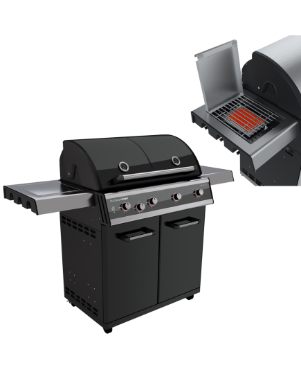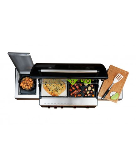 Το DUALCHEF 425 G ΒΖ συμπεριλαμβάνει το BLAZING ZONE που τοποθετείται στην αριστερή πλευρά της ψησταριάς για ψήσιμο σε πολύ υψηλές θερμοκρασίες. Η εμπειρία του μπάρμπεκιου ολοκληρώνεται με αξεσουάρ ειδικά σχεδιασμένα για το DUAL GOURMET SYSTEM, όπως το περιστρεφόμενο σετ σούβλας-καλαθιού, η μαντεμένια πλάκα, η σχάρα ψησταριάς από ανοξείδωτο χάλυβα και το σετ μαγειρέματος. Με την πέτρα πίτσας, ένα πλαίσιο από ανοξείδωτο χάλυβα αυξάνει τη θέση ψησίματος, γεγονός που επιτυγχάνει βέλτιστο συνδυασμό θερμότητας πάνω και κάτω - και ιδιαίτερα τραγανά αποτελέσματα. Προστέθηκε επίσης το χυτό πιάτο plancha, το οποίο προσφέρει άφθονο χώρο για ψητά. Διαθέτει μια πρακτική αυλάκωση χυμού για την αποστράγγιση του περιττού λίπους, καθώς και μια μικρή επιφάνεια ψησίματος με ραβδώσεις στο μπροστινό μέρος και μια αφαιρούμενη ζώνη θέρμανσης από ανοξείδωτο χάλυβα. Εκτός από την προηγμένη τεχνολογία και τα έξυπνα αξεσουάρ, τα μοντέλα DUALCHEF εντυπωσιάζουν με τον καθαρό, μοντέρνο σχεδιασμό τους σε μαύρο και βολικά χαρακτηριστικά, όπως ντουλάπι βάσης για φιάλη αερίου και αξεσουάρ. Όλα αυτά τα χαρακτηριστικά κάνουν το DUALCHEF μια τέλεια εξοπλισμένη κουζίνα εξωτερικού χώρου που δεν αφήνει τίποτα να είναι επιθυμητό.