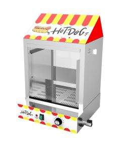 17111 (code) Συσκευή Hot Dog Station βραστήρας ατμού και θερμαντική βιτρίνα HDW-410T, σε ρετρό αμερικάνικη αισθητική με ωραία γραφικά για προβολή των Hot Dogs. Σχεδιασμένο για το  βράσιμο αλλά και την διατήρηση  σε θερμοκρασία σερβιρίσματος των hot-dog όπως επίσης και για τα ψωμάκια....