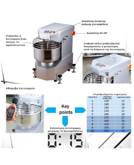 - Στροφές Μηχανήματος: Ταχύτητα ανάμειξης 130-320rpm. Ταχύτητα μπολ 13-32rpm