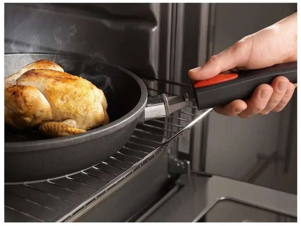 Οι αποσπώμενες λαβές σας διευκολύνουν και είναι πρακτικές και ασφαλείς, μπορείτε τις αφαιρέσετε και να βάλετε το σκεύος στο φούρνο. Αφαιρούνται εύκολα και βοηθούν την εξοικονόμηση χώρου τόσο στην αποθήκευση όσο και στο πλυντήριο. Οι αποσπώμενες λαβές δεν είναι θερμοανθεκτικές και πρέπει να αφαιρεθούν πριν από τη χρήση του σκεύους στο φούρνο.