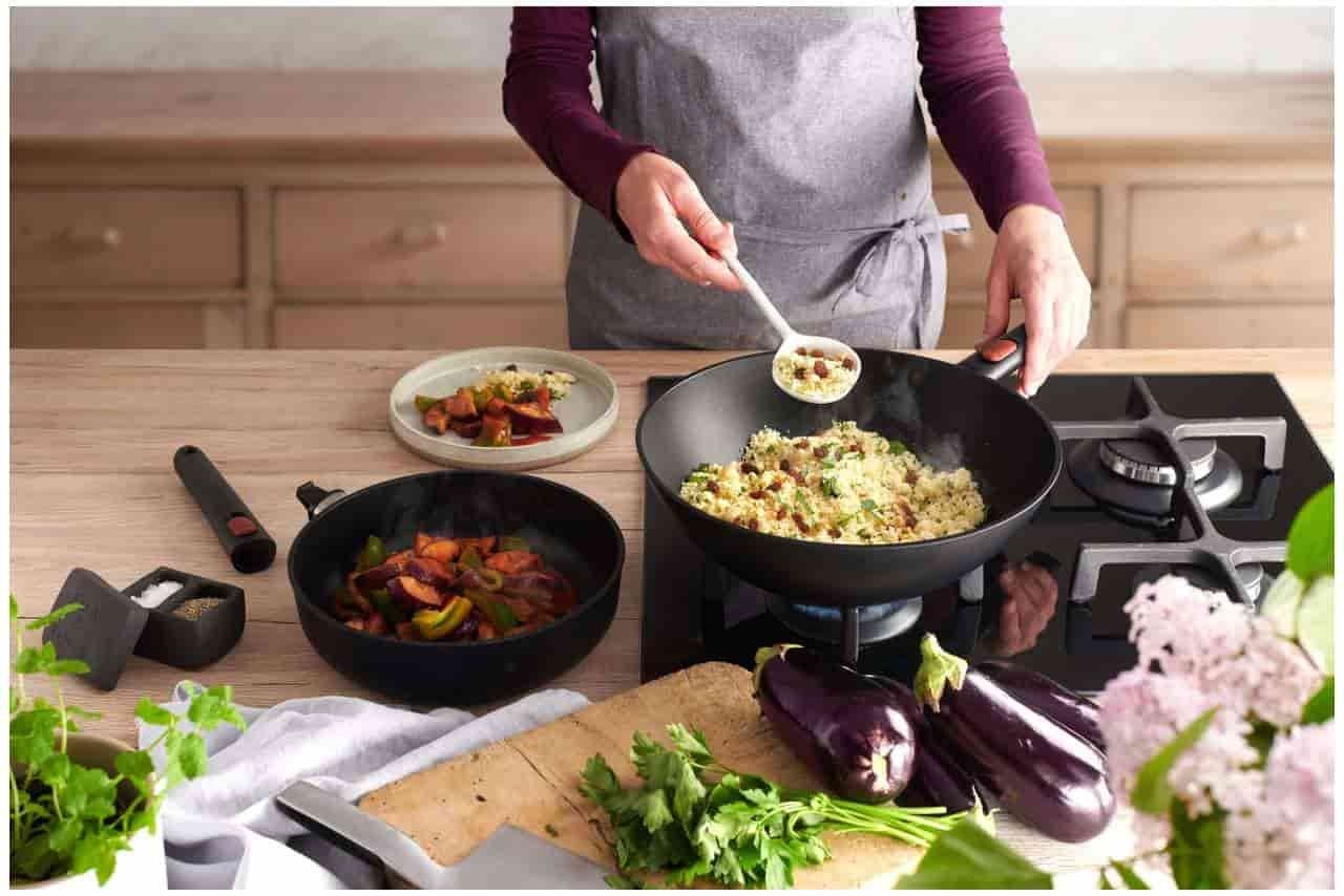 Τα σκεύη Eco Lite είναι κατασκευασμένα από 100% ανακυκλωμένο αλουμίνιο και οι λαβές περιέχουν 50% ανανεώσιμα υλικά: αλεύρι από ξύλο, που προέρχεται από τη Γερμανία, όπου κατασκευάζονται όλα τα προϊόντα. Βιωσιμότητα μέχρι την τελευταία λεπτομέρεια. Ακόμη και η συσκευασία είναι τόσο καλά μελετημένη όσο και το περιεχόμενό της, κατασκευασμένη από 100% ανακυκλωμένο χαρτόνι, τυπωμένο με οικολογικό μελάνι.